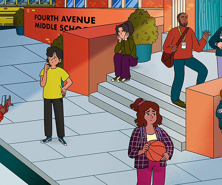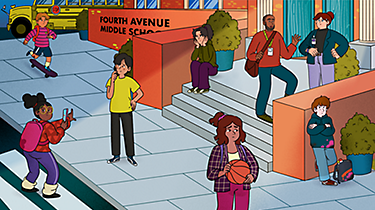 Lost in the Middle is a graphic novel that follows 8th grader Kai as he and his best friend Elle create videos for the social network, “4Reel” to help younger kids transition to Fourth Ave Middle School. It starts with easy stuff, like how to open a jammed locker, but quickly gets to the harder stuff, like how to open up to a friend about death. Each character leans on their own coping mechanisms as they struggle with different kinds of loss—but in the end, they learn to lean on each other. Their message to all of us—you are not alone.